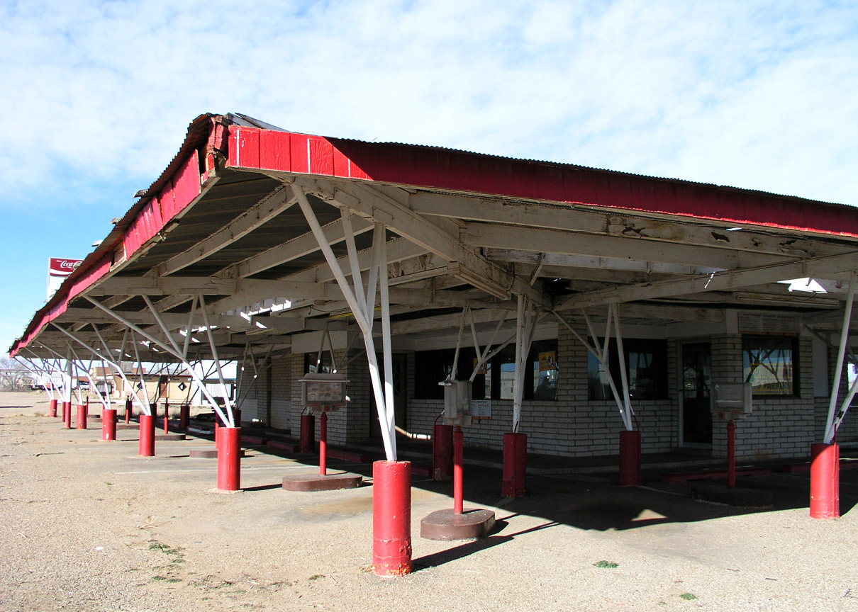 The "Westerner" is an abandoned drive-in restaurant on old Route 66 in Tucumcari. Since these images were taken in December 2003 the entire canopy has been removed.