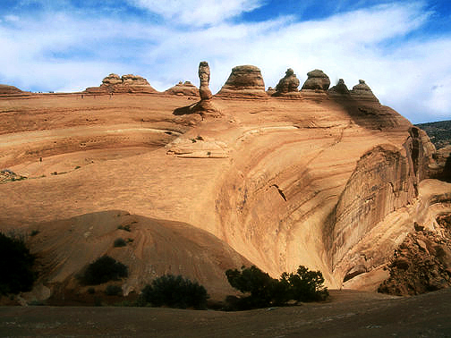 View from the bottom of the sandstone bowl at Delicate Arch in Arches National Park near Moab, UT.
