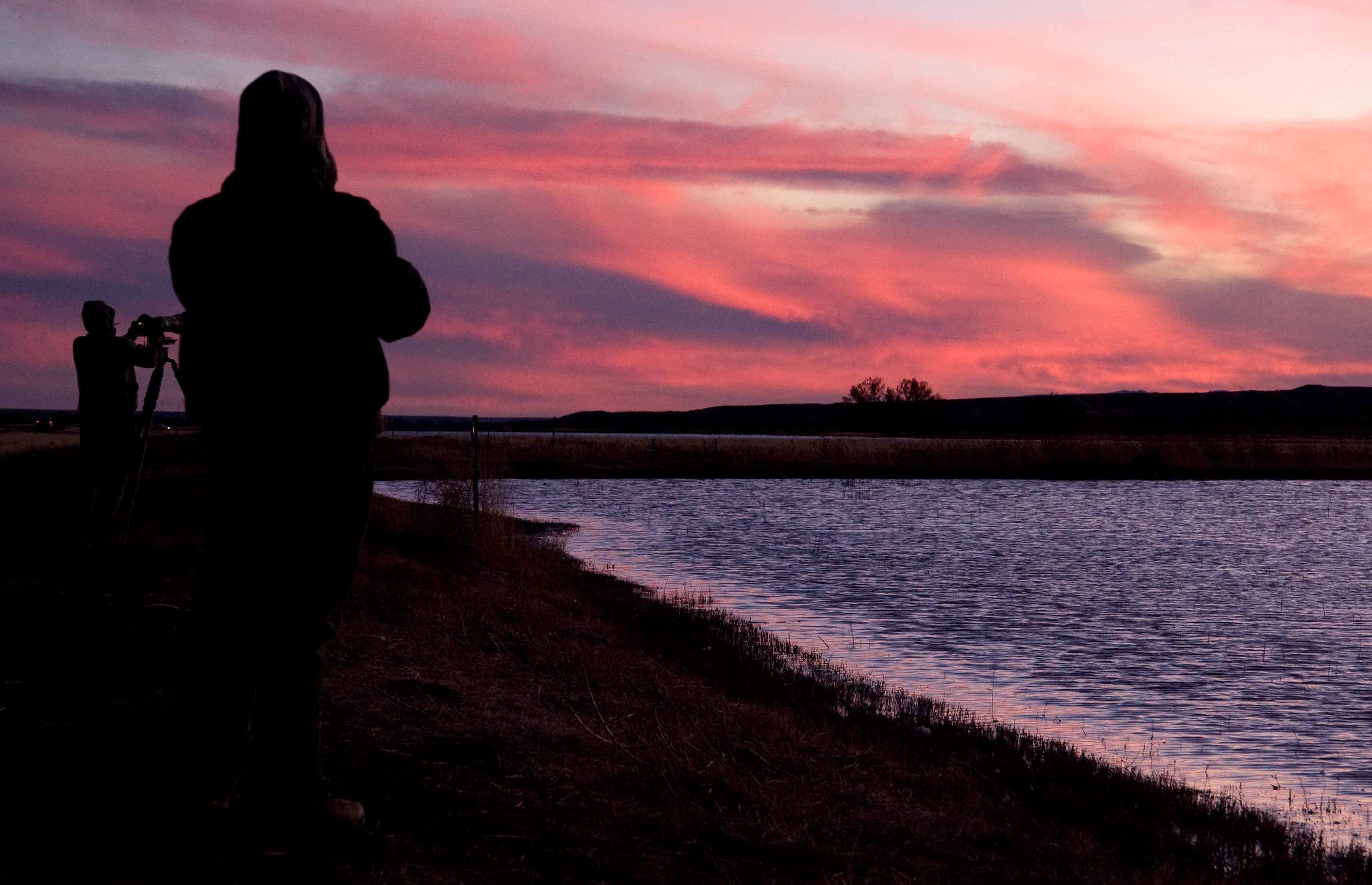 Photographers along the banks of a pond observing the fly-in of Sand Hill Cranes.