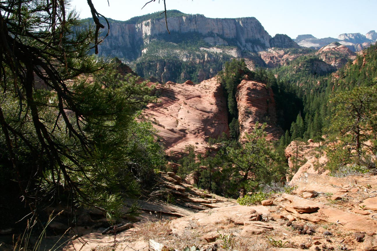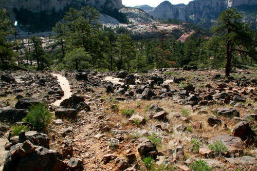 The trail down climbs to the Left Fork of North Creek via a normally dry pour-off from the