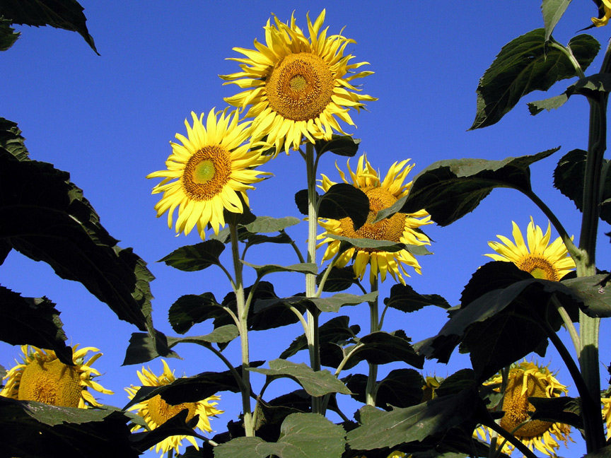 Back-lit sunflowers looking east.