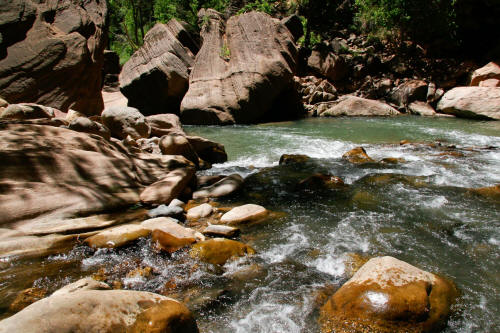 View upstream in the Virgin River Narrows. The water varies in