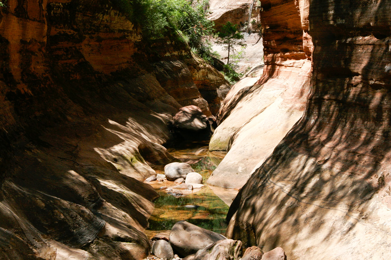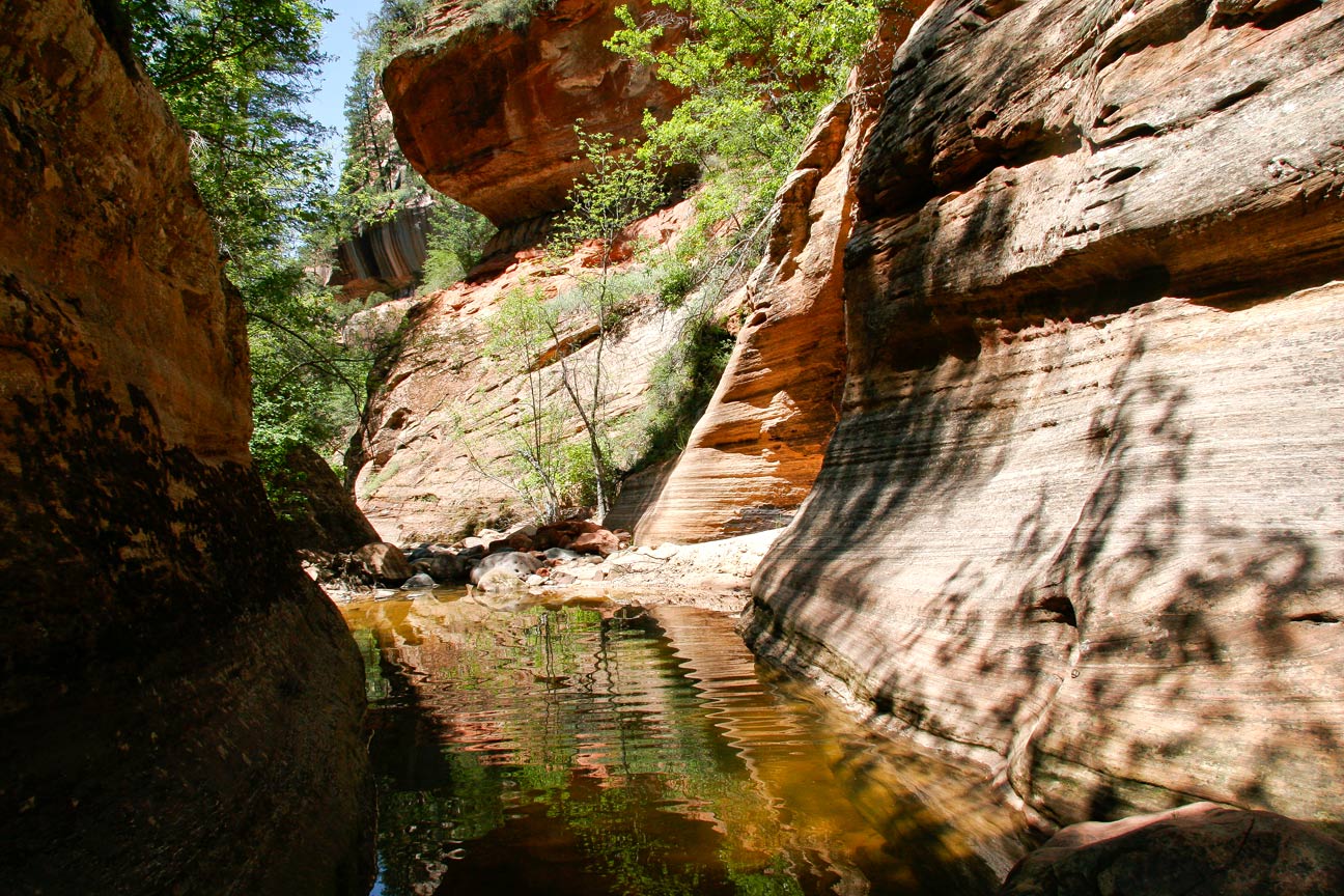 are higher on either side. There is a ledge visible on the left side of the canyon wall that allows a very sketchy passage to a high trail around the next three