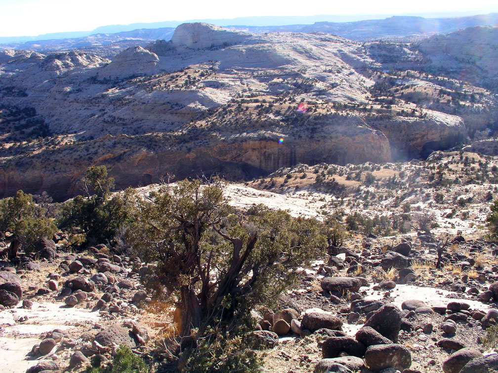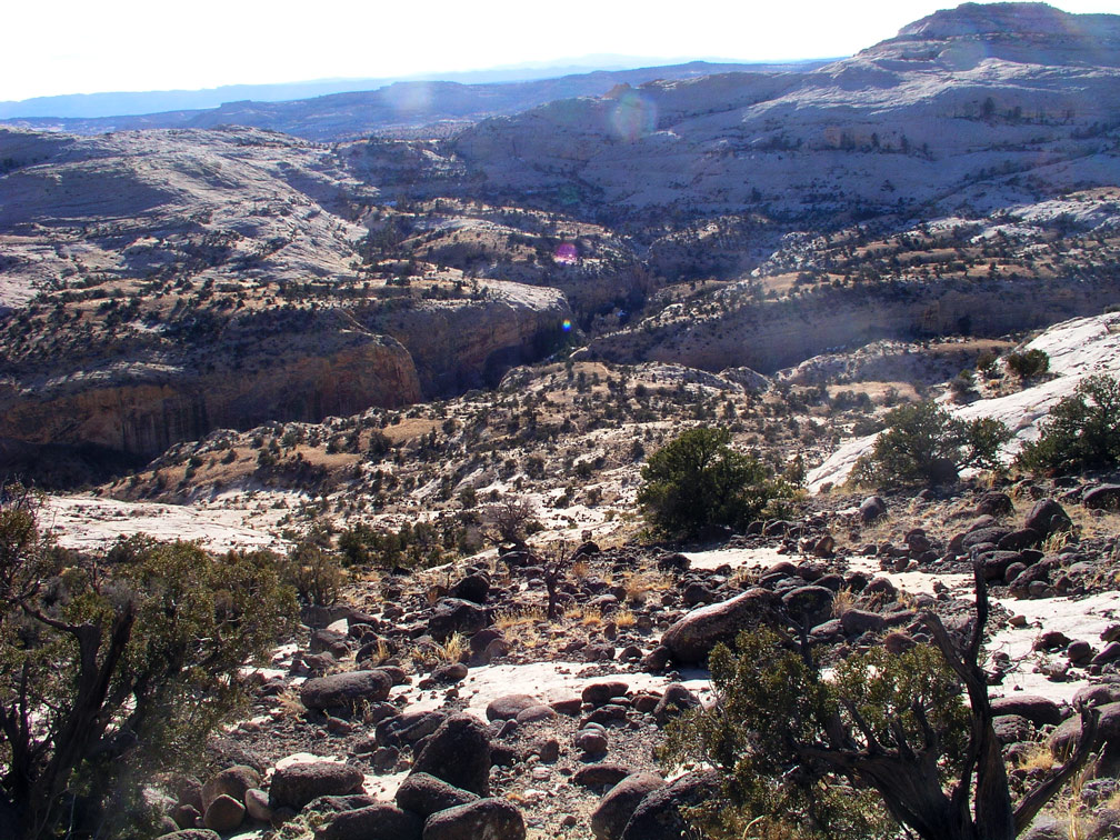 This is the view into Calf Creek Canyon from a trailhead at the edge of the Calf Creek drainage near Escalante, UT. The downclimb or hike is 600 feet plus or minus.