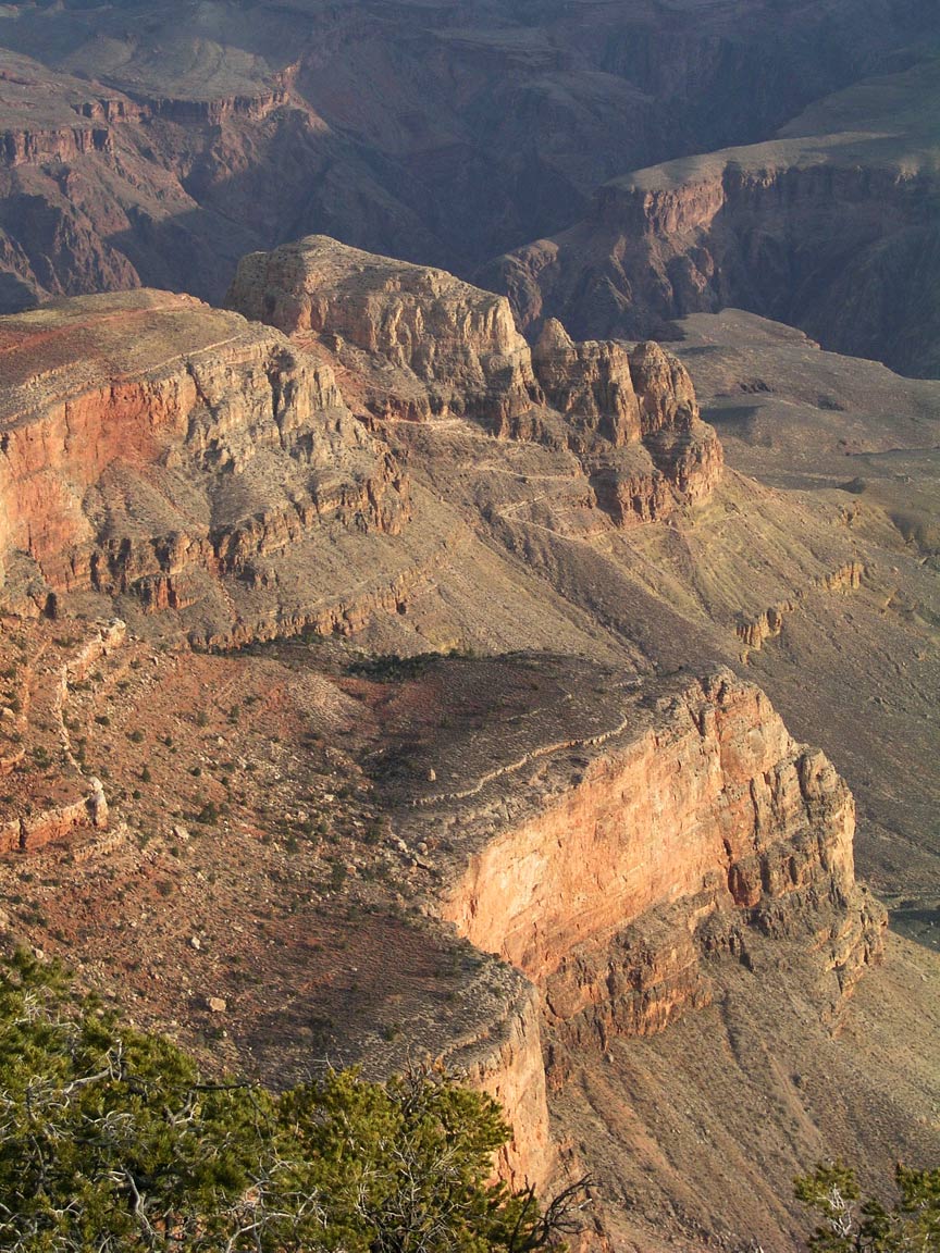 Zoomed view looking northwest to O'Neil Butte from Yaki Point at sunrise. The South Kaibab Trail is visible switchbacking down to the Tonto Platform from O'Neil Butte.