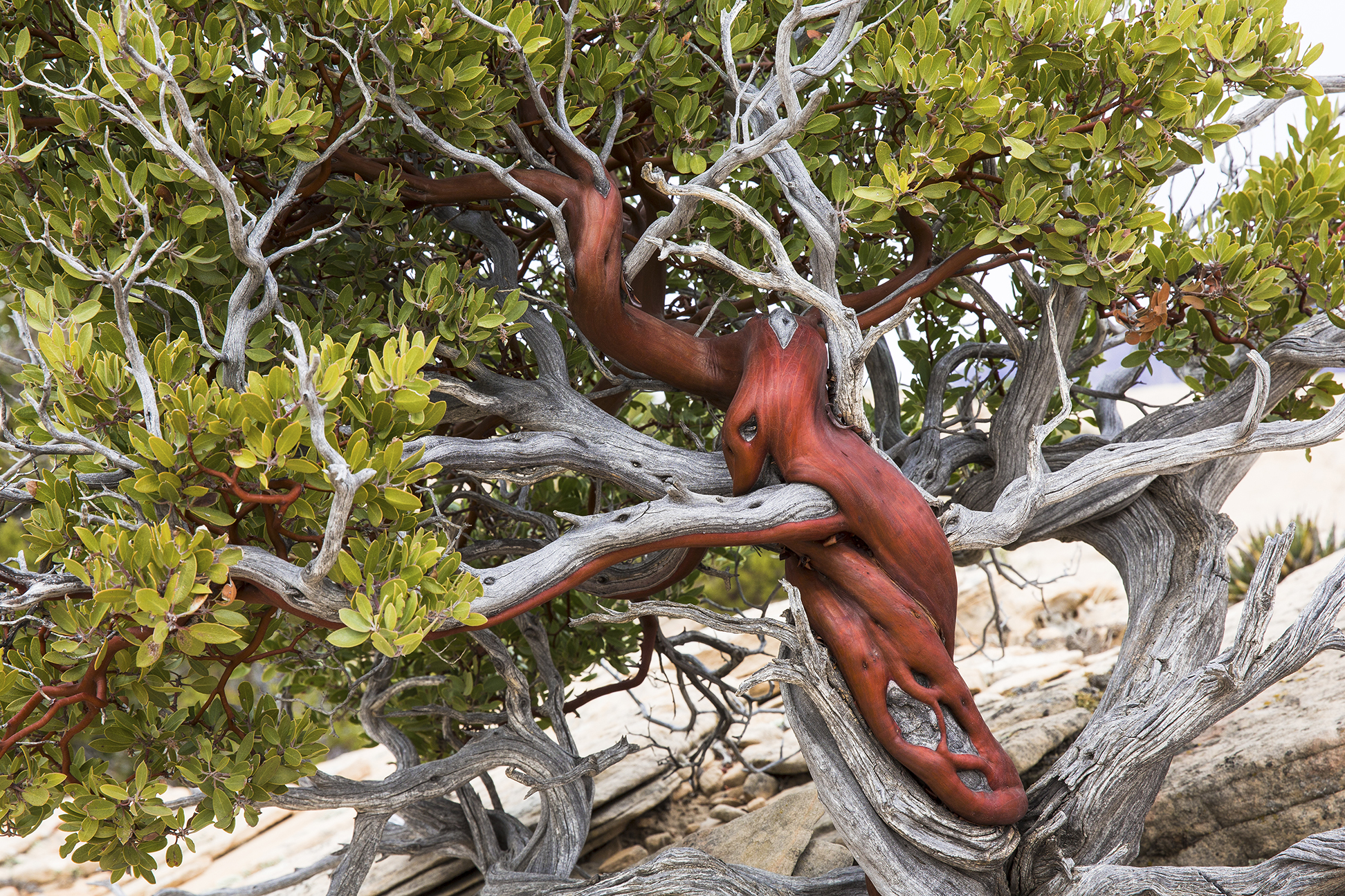 Manzanita plant in Yants Flat. This is a very desert like plant environment. The Manzainta appears to grow on the dead branches of either another manzanita plant, juniper or pinyon pine remnants.